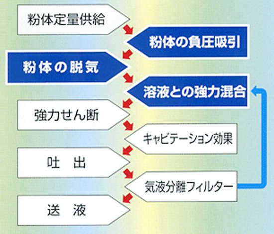 - 粉体の吸引、脱気、負圧下混合で従来にない溶解を実現しました。
