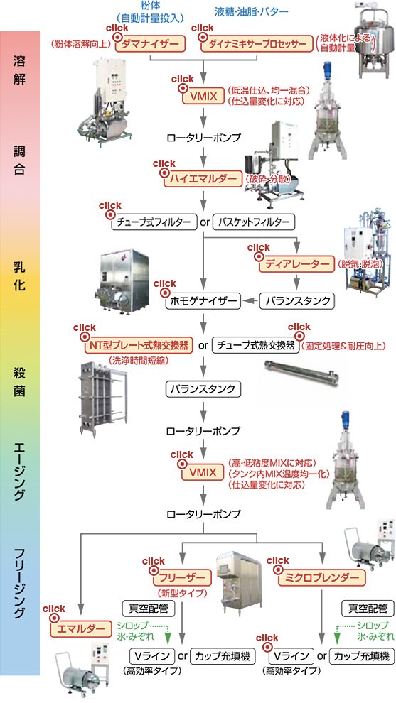 製品の特長 最新の自動運転機構を装備し、ワンタッチ操作で安定的に自動生産できます。 高脂肪からシャーベットまで、広範囲の舌触りのよい製品を生産できます。 高度な自動オーバーラン・かたさコントロール・シリンダー内圧コントロールを装備しております。 資料ダウンロード 製品のお問い合わせ Proposalアイスクリーム製造設備のご提案