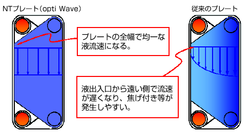 プレート伝熱面で左右異なった波形状(Opti Wave=最適な波)を採用し、左右流路の圧力損失を変えることで、伝熱面全幅において液流速を均一化し、運転時間の延長と洗浄時間の短縮を実現しました。