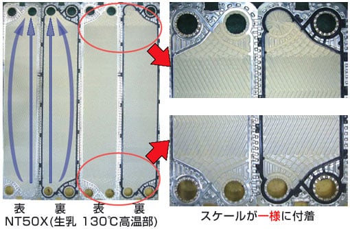 左右の流路圧力損失を変える事で、伝熱面での不均一な流れを無くし、局部的な汚れが減少