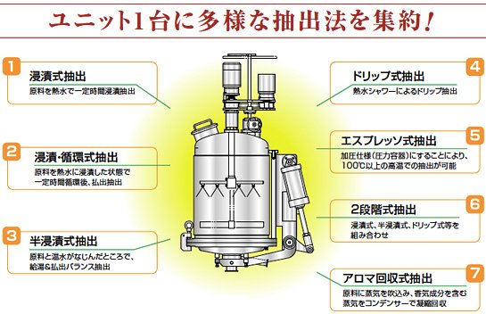 コーヒー・紅茶に豊な風味を添えるドリップ式抽出、ウーロン茶・麦茶のコクを生む半浸漬式抽出、緑茶、玉露の香りと味を引き出す浸漬式抽出、そして漢方薬・調味エキスの友好成分を高い効率で回収する加圧式抽出まで、ほとんどすべての抽出ニーズをカバーします。